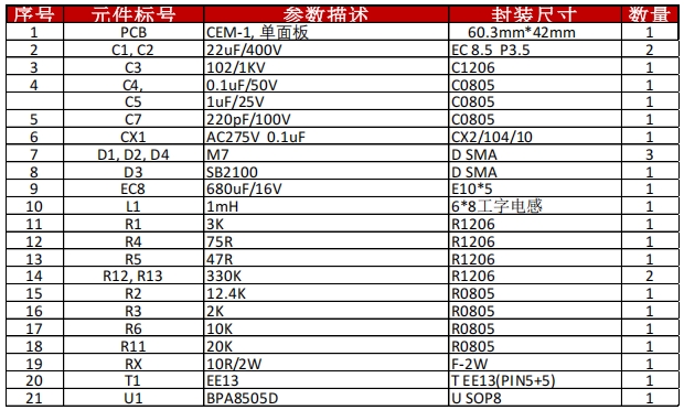 在電源管理設(shè)計(jì)領(lǐng)域,BPA8505D是一款備受推崇的芯片,它以其卓越的性能和靈活性,為工程師提供了一個(gè)全面的參考設(shè)計(jì)。本文將全面介紹BPA8505D的參考設(shè)計(jì),包括簡(jiǎn)介、電路圖、物料清單(BOM)、PCB布局圖、電路實(shí)物圖以及變壓器規(guī)格書(shū),為讀者提供一個(gè)從設(shè)計(jì)到實(shí)現(xiàn)的完整視角。