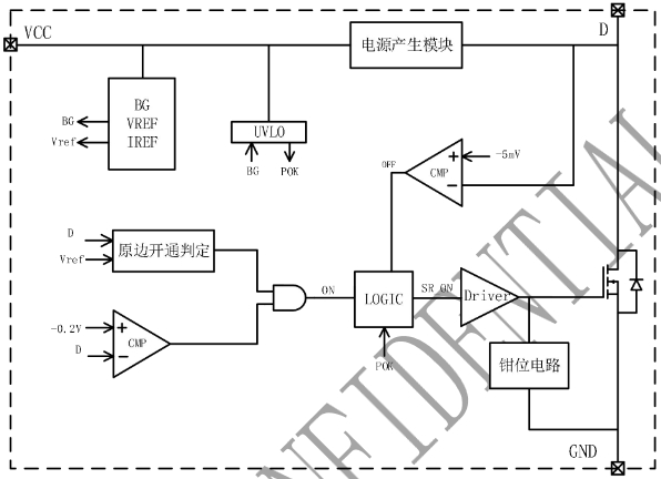 開通控制:采用專利的整流管開通技術,通過檢測漏極電壓(D腳)與地(GND)之間的下降電壓閾值和下降速率,準確判斷同步整流管的開通時機.開通條件包括同步最小關斷時間(TSR)大于2us,開通檢測斜率(dVds/dt)大于設定值,且Vds小于-0.2V。