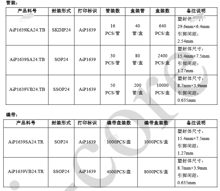 AiP1639KA24.TB:采用SKDIP24封裝形式,適用于需要較大引腳間距的應(yīng)用場景。其塑封體尺寸為29.6mm×6.4mm,引腳間距為2.54mm。