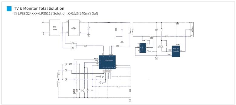 本方案旨在設計一款75W的電源,適用于需要高效率和小體積的應用場景。方案采用高頻QR控制器LP8842xXX,以及基于GaN技術的LP88G24xxx,以實現高效率和高功率密度的設計目標。