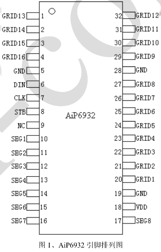 AiP6932是一款由無錫中微愛芯電子有限公司生產(chǎn)的3線串口共陰極8段16位LED驅(qū)動(dòng)控制專用電路。這款芯片在LED顯示面板場合有著廣泛的應(yīng)用,如電磁爐、電飯煲、空調(diào)、機(jī)頂盒等家電產(chǎn)品的顯示。本文將詳細(xì)介紹AiP6932的引腳功能,為工程師和設(shè)計(jì)師提供全面的技術(shù)參考。