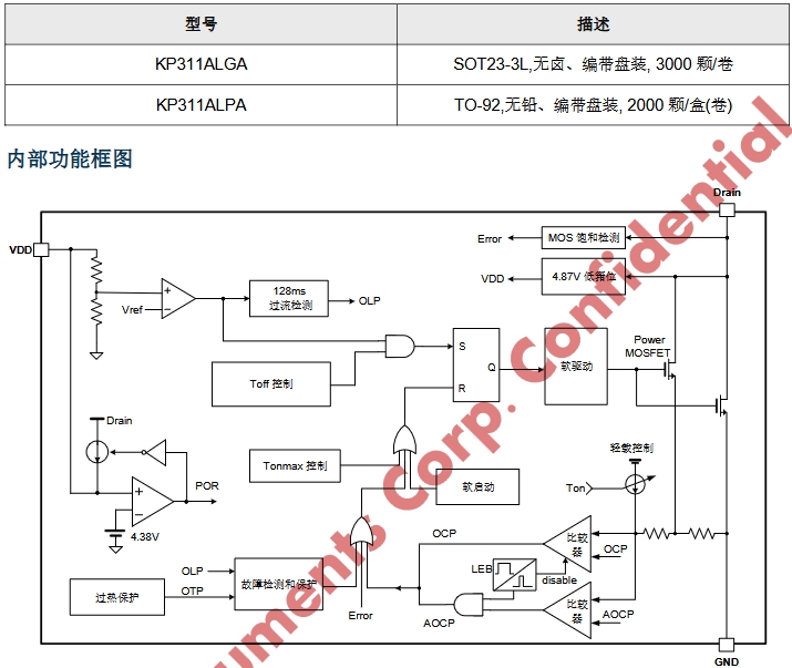 KP311AWPA具備一系列智能控制和保護功能,確保了芯片在各種工作條件下的穩(wěn)定性和安全性。芯片內(nèi)部設計有軟啟動電路,能夠在啟動時逐漸增加過流保護閾值,避免了啟動瞬間的電流沖擊。此外,還集成了VDD欠壓保護、逐周期電流限制、異常過流保護、過熱保護、過載保護等多種保護功能,全方位保障了芯片及外部電路的安全運行。