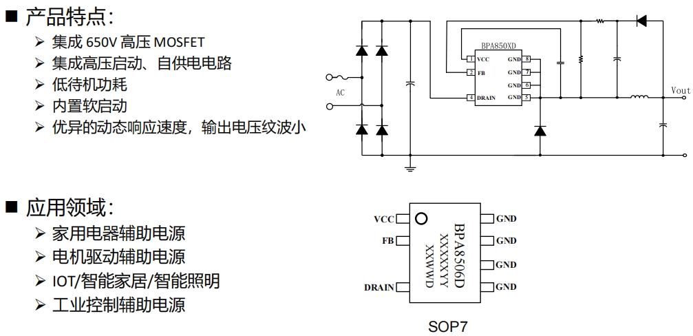 BPA8506D是一款集成了650V高壓MOSFET的高性能電源管理芯片,專為滿足家用電器、電機(jī)驅(qū)動(dòng)、物聯(lián)網(wǎng)設(shè)備以及工業(yè)控制等領(lǐng)域的輔助電源需求而設(shè)計(jì)。它不僅具備高壓啟動(dòng)和自供電功能,還實(shí)現(xiàn)了低待機(jī)功耗、優(yōu)異的動(dòng)態(tài)響應(yīng)速度以及低輸出電壓紋波等特性,極大地提升了電源系統(tǒng)的整體性能。