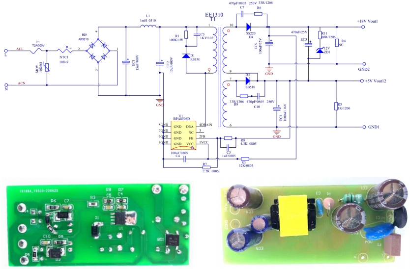 BPA8506D參考設(shè)計(jì)的電路圖和實(shí)物圖展示了其簡潔而高效的布局。通過合理選擇元件和優(yōu)化電路結(jié)構(gòu),該設(shè)計(jì)實(shí)現(xiàn)了高性能與高可靠性的平衡。例如,采用EE1310磁芯的變壓器,其初級(jí)繞組感量為950uH±7%,漏感量小于30uH,確保了高效的能量傳輸和穩(wěn)定的輸出電壓。此外,電路中還配備了多種保護(hù)機(jī)制,如短路保護(hù)、過流保護(hù)等,進(jìn)一步提升了系統(tǒng)的安全性。