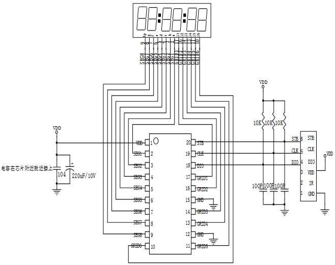 GRID1至GRID6引腳連接到LED顯示屏的位驅(qū)動端,用于控制顯示屏的位顯示。
