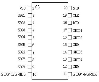 AIP1620芯片采用SOP20封裝,具有20個引腳,每個引腳都有明確的功能定義。例如,VDD引腳為邏輯電源輸入,SEG1至SEG8為段輸出引腳,GRID1至GRID6為位輸出引腳,DIO引腳用于串行數(shù)據(jù)輸入/輸出,CLK引腳為時鐘輸入,STB引腳用于片選和初始化。這些引腳的合理布局和功能設計,使得AIP1620能夠與外部電路無縫連接,實現(xiàn)高效的信號傳輸和控制。