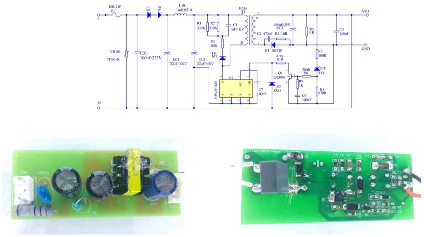 輸出整流濾波電路由肖特基二極管D4和電解電容EC3組成,將高頻脈沖電壓整流為穩(wěn)定的直流輸出電壓。反饋控制電路由光耦、穩(wěn)壓管ZD1和電阻R9等元件組成,用于檢測(cè)輸出電壓的變化,并將其反饋到BPA8616D芯片,以實(shí)現(xiàn)輸出電壓的穩(wěn)定調(diào)節(jié)。