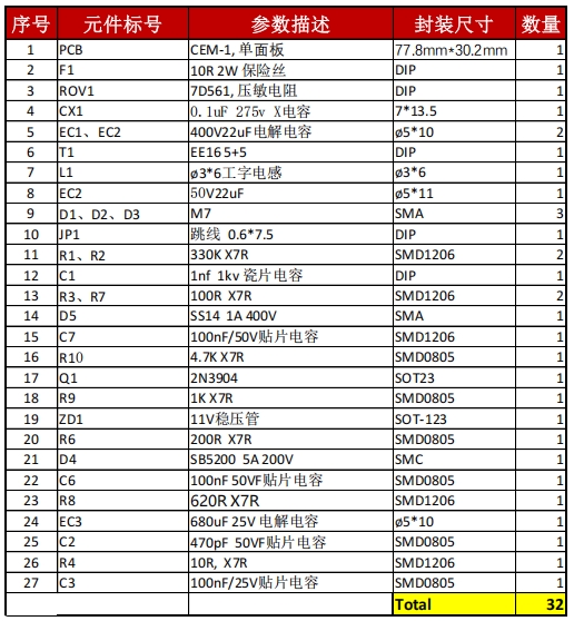 以下是該電源設(shè)計(jì)的主要元件清單: