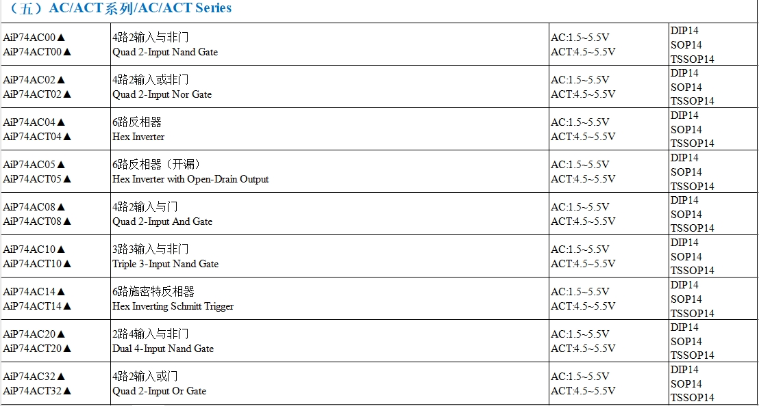 AC(先進CMOS)和ACT(先進CMOS TTL兼容)系列適用于高速應用。國產AiP74AC系列和AiP74ACT系列在高速性能上與進口產品相當。例如,AiP74AC00(4路2輸入與非門)與TI的SN74AC00在工作電壓(1.5~5.5V)、傳播延遲(3ns)和封裝形式(DIP14, SOP14, TSSOP14)上完全兼容。