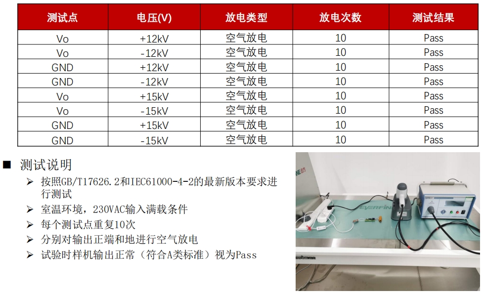 ESD(靜電放電)測試是評估電源芯片抗靜電干擾能力的關鍵測試。S7142S在ESD測試中表現出色,其輸出端和地端在±12kV和±15kV的空氣放電條件下均能正常工作,符合A類標準。這表明S7142S在抗靜電干擾方面具有卓越的性能,能夠有效保護設備免受靜電損壞。