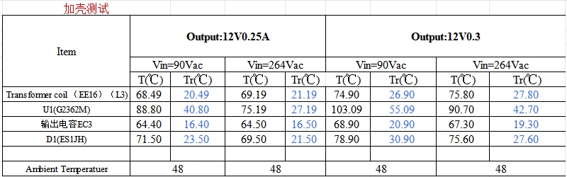 溫升測試結(jié)果顯示,兩款芯片在滿載運(yùn)行時(shí),關(guān)鍵部件的溫度上升均在安全范圍內(nèi)。例如,變壓器線圈(EE16)的溫升在73℃至75.5℃之間,遠(yuǎn)低于其最高工作溫度,確保了產(chǎn)品的長期可靠性。