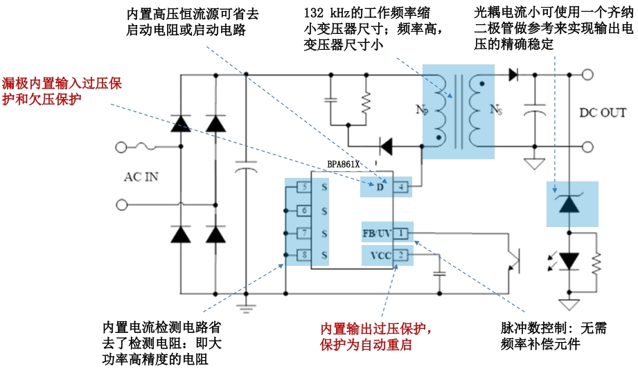 在設(shè)計(jì)細(xì)節(jié)上,BPA861X 也展現(xiàn)出了諸多優(yōu)化之處。它內(nèi)置了高壓恒流源,可以省去啟動電阻或啟動電路,簡化了外圍電路設(shè)計(jì),降低了成本。同時(shí),BPA861X 還內(nèi)置了電流檢測電路,省去了檢測電阻,這不僅減少了外圍元件數(shù)量,還提高了檢測精度和可靠性。相比之下,友商產(chǎn)品在這些方面往往需要額外的外圍元件來實(shí)現(xiàn)相同的功能,這不僅增加了設(shè)計(jì)復(fù)雜度和成本,還可能因元件數(shù)量的增加而降低系統(tǒng)的可靠性。