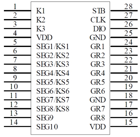 • DIO、CLK和STB引腳:這些引腳用于與外部微控制器進行通信。DIO引腳用于數據傳輸,CLK引腳用于時鐘信號,STB引腳用于片選信號。確保這些引腳的連接正確,以實現穩定的數據傳輸。