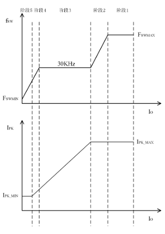 通過啟動電路給VCC電容充電,VCC達到啟動電壓VCC_ST,芯片輸出PWM開關信號。此時輸出電壓開始上升,因輸出電壓還小,VCC電壓會下降到3.5V,VCC通過自供電維持在3.5V。PWM開關信號經過以下3個階段,軟啟動結束。軟啟動結束時,輸出電壓上升到VO_MIN:若VO_MIN>3.5V,芯片正常工作;若VO_MIN<3.5V,芯片輸出短路保護。