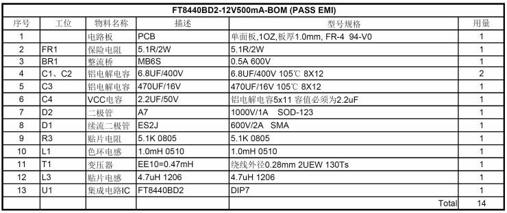 以下是FT8440BD2方案的物料清單,包括了電路板、保險電阻、整流橋、鋁電解電容、貼片電容、二極管、貼片電阻、色環電感、變壓器、貼片電感和集成電路IC等元件。這些元件均為高品質的常用元件,易于采購且成本較低。