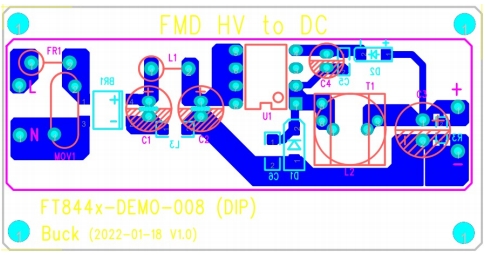 PCB布局對于電源性能至關重要,FT8440BD2方案采用了單面板雙面元件的設計,PCB厚度為1mm。PCB頂面為插件元件,底面為貼片元件。這種布局方式不僅節省空間,而且便于生產和維護。