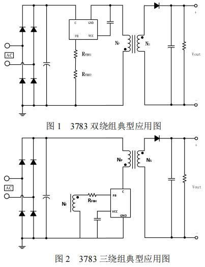 三繞組應(yīng)用是3783系列芯片的另一種典型應(yīng)用方式,其典型應(yīng)用電路如圖2所示。在這種應(yīng)用中,3783芯片的FB腳通過(guò)變壓器輔助繞組和FB腳的外置電阻反饋輸出電壓,與內(nèi)部基準(zhǔn)比較形成閉環(huán),從而恒定輸出電壓。
