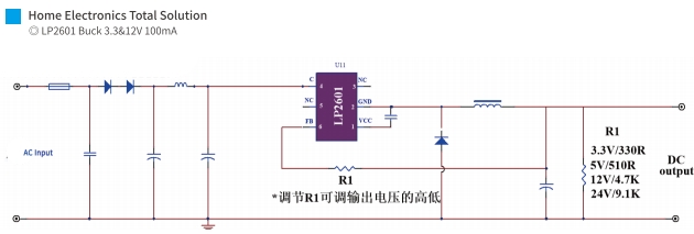 LP2601:適用于OR模式,輸出電壓可調(diào)的Buck降壓電路,推薦電壓為3.3V或5V,最大輸出電流可達(dá)100mA。這款芯片適合需要靈活電壓調(diào)節(jié)的應(yīng)用場景。