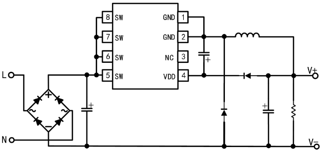 芯片內部集成了高壓啟動電路、電流采樣電路和電壓反饋回路,無需外部啟動電阻、電流采樣電阻和電壓采樣電阻,進一步降低了系統成本和體積。